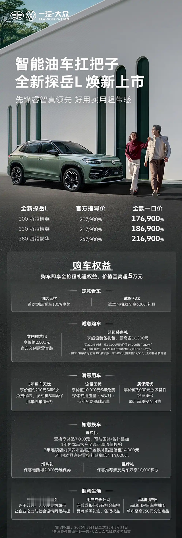 3月1日,全新一汽-大众探岳L正式上市,新车共推出3款车型,一口价区间为17.69-21.69万元,截止日期为3月31日,指导价区间20.79-24.79万元。全新大众探岳L基于MQB Evo平台打造,其针对外观设计,车身尺寸、内饰以及配置均进行了全方位的升级,整体产品力得到大幅提升。